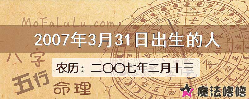 2007年3月31日出生的人,如果出生日期是公历(新历/阳历)时间,对应的农历(旧历/阴历)为二〇〇七年二月十三,八字干支为丁亥年/癸卯月/甲子日。本日出生的人生肖属猪,星座属于白羊座。