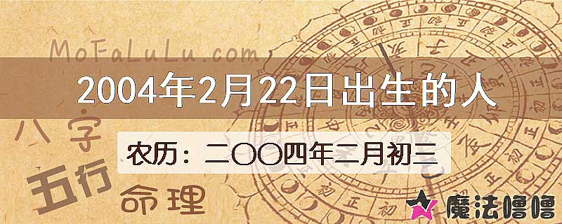 简述: 农历(亦名阴历/旧历)二〇〇四年二月初三(2004年2月3日)出生的人,本命属猴,泉中水命;日主天干为泉中水辛,生于冬季。生辰八字为甲申年/丙寅月/辛未日/X(X为具体时辰);本日每个时辰的五行都有可能不同,具体的五行信息请查看自己对应的时辰。