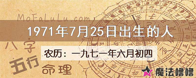 阳历1971年7月25日出生对应的农历是一九七一年六月初四,农历1971年出生的生肖都属猪。(十二生肖顺序:鼠-牛-虎-兔-龙-蛇-马-羊-猴-鸡-狗-猪)