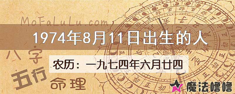 阳历1974年8月11日出生对应的农历是一九七四年六月廿四,农历1974年出生的生肖都属虎。(十二生肖顺序:鼠-牛-虎-兔-龙-蛇-马-羊-猴-鸡-狗-猪)