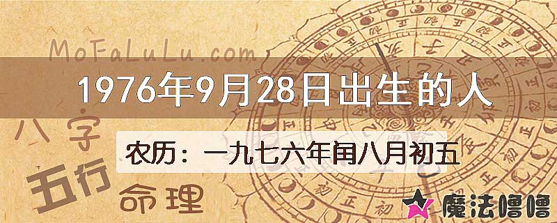 | 公历1976年9月28日 | 农历一九七六年闰八月初五 |