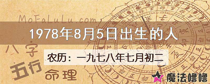 阳历1978年8月5日出生对应的农历是一九七八年七月初二,农历1978年出生的生肖都属马。(十二生肖顺序:鼠-牛-虎-兔-龙-蛇-马-羊-猴-鸡-狗-猪)