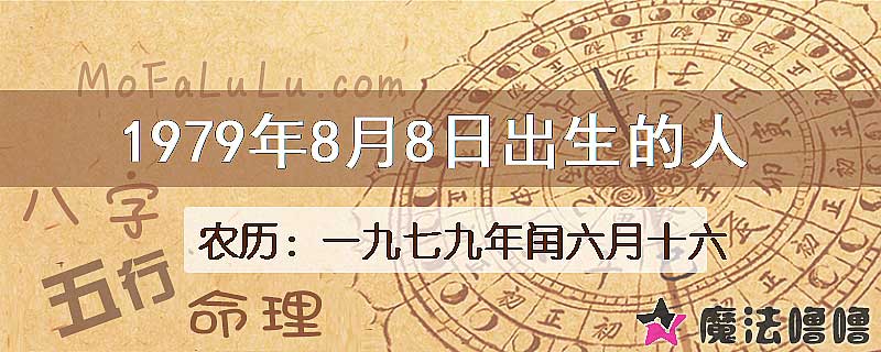 1979年8月8日出生的人,如果出生日期是公历(新历/阳历)时间,对应的农历(旧历/阴历)为一九七九年闰六月十六,八字干支为己未年/壬申月/丁未日。本日出生的人生肖属羊,星座属于狮子座。