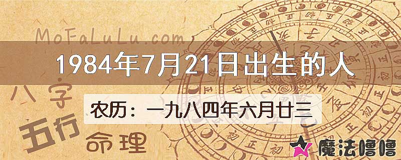 阳历1984年7月21日出生对应的农历是一九八四年六月廿三,农历1984年出生的生肖都属鼠。(十二生肖顺序:鼠-牛-虎-兔-龙-蛇-马-羊-猴-鸡-狗-猪)