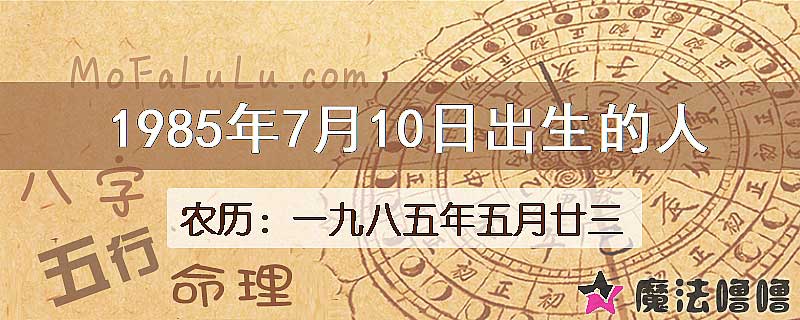 阳历1985年7月10日出生对应的农历是一九八五年五月廿三,农历1985年出生的生肖都属牛。(十二生肖顺序:鼠-牛-虎-兔-龙-蛇-马-羊-猴-鸡-狗-猪)