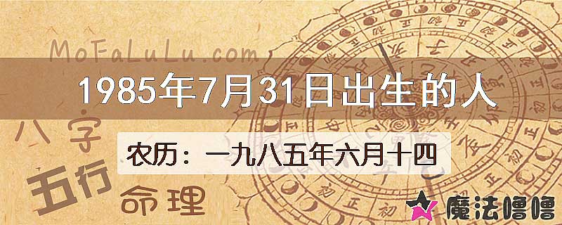 | 公历1985年7月31日 | 农历一九八五年六月十四 |