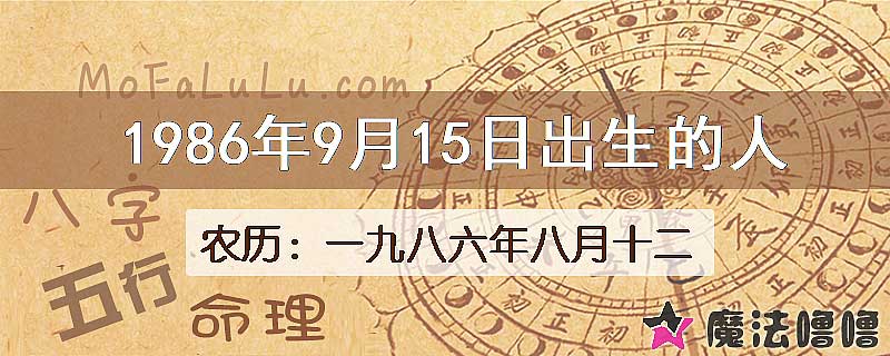 | 公历1986年9月15日 | 农历一九八六年八月十二 |