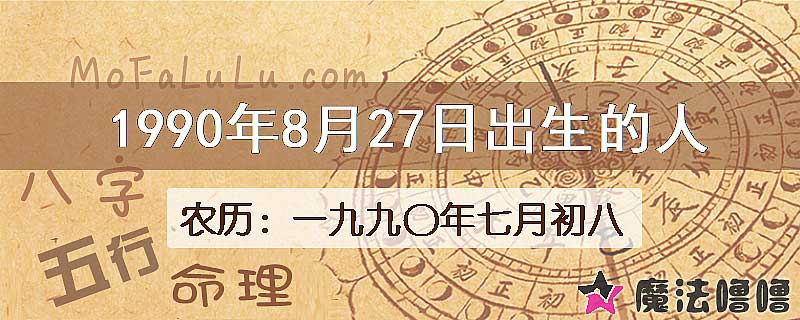 阳历1990年8月27日出生对应的农历是一九九〇年七月初八,农历1990年出生的生肖都属马。(十二生肖顺序:鼠-牛-虎-兔-龙-蛇-马-羊-猴-鸡-狗-猪)