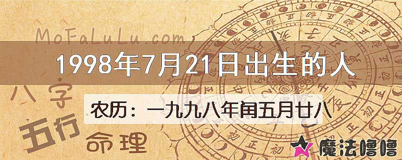 阳历1998年7月21日出生对应的农历是一九九八年闰五月廿八,农历1998年出生的生肖都属虎。(十二生肖顺序:鼠-牛-虎-兔-龙-蛇-马-羊-猴-鸡-狗-猪)