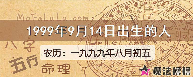 1999年9月14日出生的人,如果出生日期是公历(新历/阳历)时间,对应的农历(旧历/阴历)为一九九九年八月初五,八字干支为己卯年/癸酉月/己巳日。本日出生的人生肖属兔,星座属于处女座。