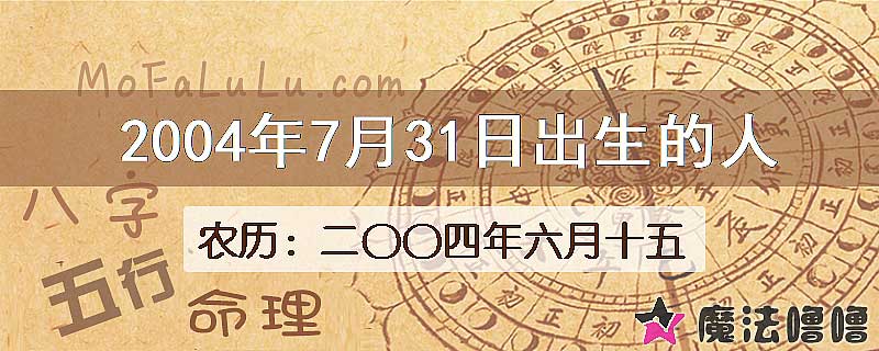2004年7月31日出生的人,如果出生日期是公历(新历/阳历)时间,对应的农历(旧历/阴历)为二〇〇四年六月十五,八字干支为甲申年/辛未月/辛亥日。本日出生的人生肖属猴,星座属于狮子座。