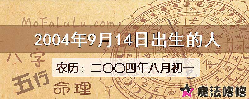 2004年9月14日出生的人,如果出生日期是公历(新历/阳历)时间,对应的农历(旧历/阴历)为二〇〇四年八月初一,八字干支为甲申年/癸酉月/丙申日。本日出生的人生肖属猴,星座属于处女座。