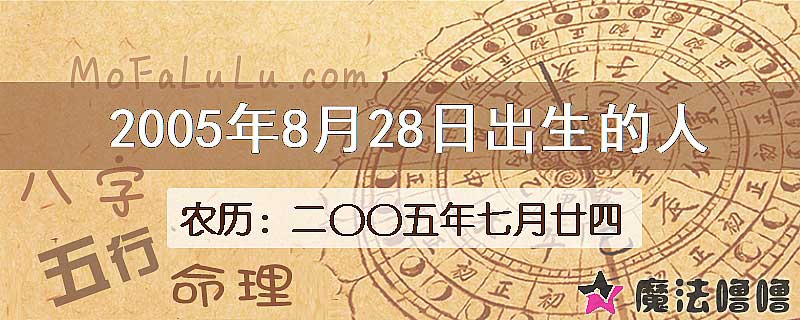 2005年8月28日出生的人,如果出生日期是公历(新历/阳历)时间,对应的农历(旧历/阴历)为二〇〇五年七月廿四,八字干支为乙酉年/甲申月/甲申日。本日出生的人生肖属鸡,星座属于处女座。