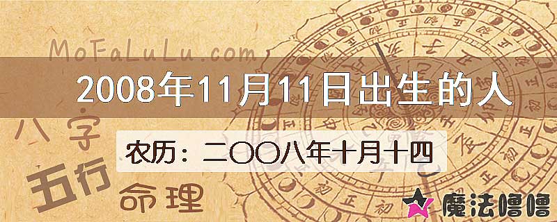2008年11月11日出生的人,如果出生日期是公历(新历/阳历)时间,对应的农历(旧历/阴历)为二〇〇八年十月十四,八字干支为戊子年/癸亥月/乙卯日。本日出生的人生肖属鼠,星座属于天蝎座。