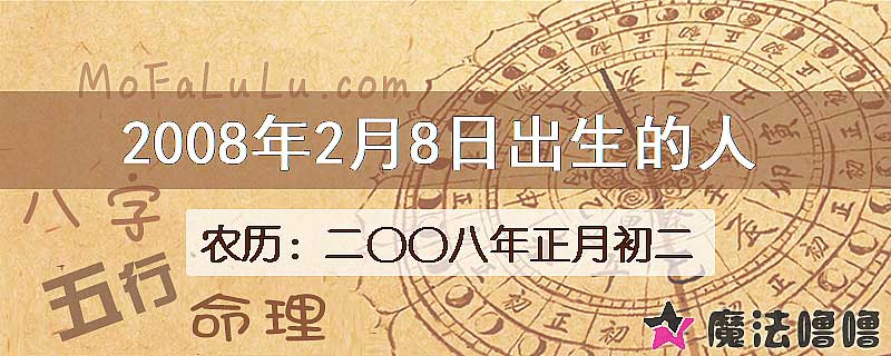 2、农历(阴历)2008年2月8日对应的新历日期是2008年3月15日,本日出生的人属于双鱼座(Pisces)。双鱼男善良、好脾气、温柔,而双鱼女性格自觉、唯美、温柔。更详细的[双鱼座]分析>