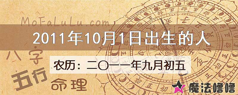 阳历2011年10月1日出生对应的农历是二〇一一年九月初五,农历2011年出生的生肖都属兔。(十二生肖顺序:鼠-牛-虎-兔-龙-蛇-马-羊-猴-鸡-狗-猪)