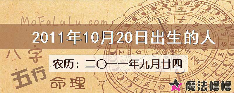 阳历2011年10月20日出生对应的农历是二〇一一年九月廿四,农历2011年出生的生肖都属兔。(十二生肖顺序:鼠-牛-虎-兔-龙-蛇-马-羊-猴-鸡-狗-猪)