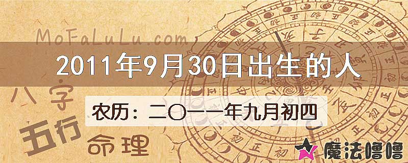 阳历2011年9月30日出生对应的农历是二〇一一年九月初四,农历2011年出生的生肖都属兔。(十二生肖顺序:鼠-牛-虎-兔-龙-蛇-马-羊-猴-鸡-狗-猪)