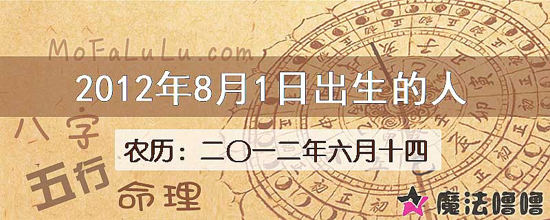阳历2012年8月1日出生对应的农历是二〇一二年六月十四,农历2012年出生的生肖都属龙。(十二生肖顺序:鼠-牛-虎-兔-龙-蛇-马-羊-猴-鸡-狗-猪)