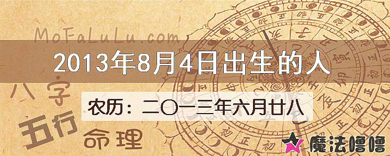 2013年8月4日出生的人,如果出生日期是公历(新历/阳历)时间,对应的农历(旧历/阴历)为二〇一三年六月廿八,八字干支为癸巳年/己未月/壬寅日。本日出生的人生肖属蛇,星座属于狮子座。