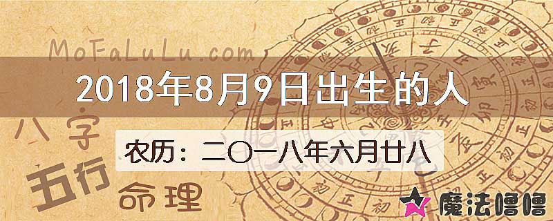 2018年8月9日出生的人,如果出生日期是公历(新历/阳历)时间,对应的农历(旧历/阴历)为二〇一八年六月廿八,八字干支为戊戌年/庚申月/癸酉日。本日出生的人生肖属狗,星座属于狮子座。