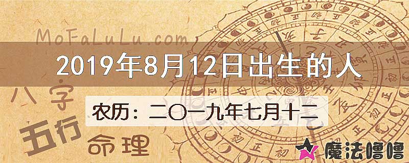 2019年8月12日出生的人,如果出生日期是公历(新历/阳历)时间,对应的农历(旧历/阴历)为二〇一九年七月十二,八字干支为己亥年/壬申月/辛巳日。本日出生的人生肖属猪,星座属于狮子座。