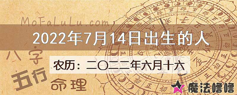 2022年7月14日出生的人,如果出生日期是公历(新历/阳历)时间,对应的农历(旧历/阴历)为二〇二二年六月十六,八字干支为壬寅年/丁未月/戊辰日。本日出生的人生肖属虎,星座属于巨蟹座。