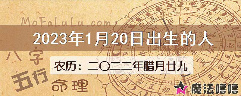 阳历2023年1月20日出生对应的农历是二〇二二年腊月廿九,农历2022年出生的生肖都属虎。(十二生肖顺序:鼠-牛-虎-兔-龙-蛇-马-羊-猴-鸡-狗-猪)