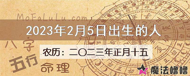 2023年2月5日出生的人,如果出生日期是公历(新历/阳历)时间,对应的农历(旧历/阴历)为二〇二三年正月十五,八字干支为癸卯年/甲寅月/甲午日。本日出生的人生肖属兔,星座属于水瓶座。
