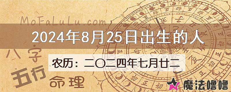 阳历2024年8月25日出生对应的农历是二〇二四年七月廿二,农历2024年出生的生肖都属龙。(十二生肖顺序:鼠-牛-虎-兔-龙-蛇-马-羊-猴-鸡-狗-猪)
