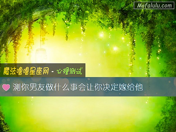 爱情要走向婚姻有时候很简单,有时候又很难,很多时候也可能会因为对方的一个举动就会让我们有一种想要结婚的冲动了。那么你男友做什么事会让你决定嫁给他呢?通过以下免费的爱情测试试题,看看测你男友做什么事会让你决定嫁给他的测试结果如何吧!